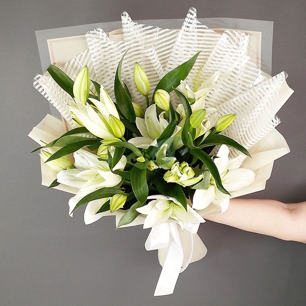 Белые лилии – это недорогой, но очень красивый букет в подарок. Этими цветами можно поблагодарить учителя, врача, дополнить подарок к празднику или извиниться перед женой и мамой.
